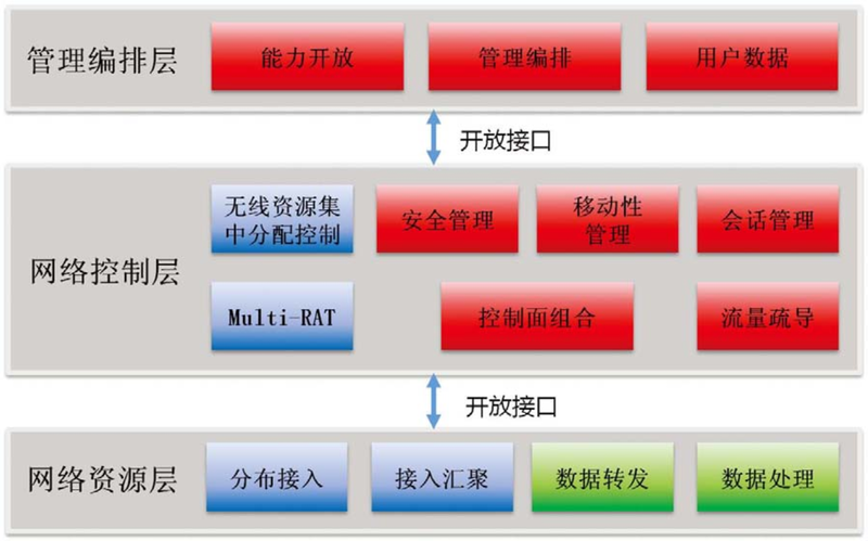 进一步,面对前文描述的5G极致的体验、效率和性能要求,以及万物互联”的愿景,通过采用SDN和NFV技术,5G在网络架构重构方面遵循网络业务融合和按需服务提供的核心理念,并引入更丰富的无线接入网拓扑,提供更灵活的无线控制、业务感知和协议栈定制能力等。