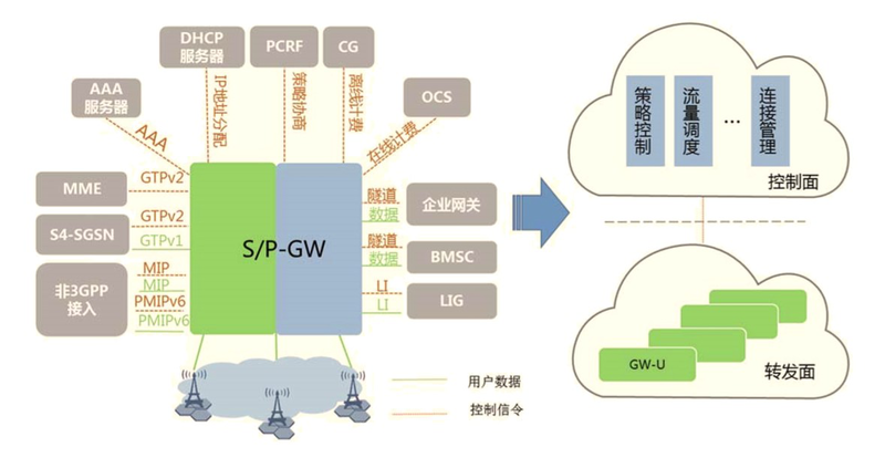 在传统3G/4G网络中,对于某位利用4观看腾讯体育节目的G用户而言,即便他就处在腾讯视频数据中心附近,但这些节目仍然要通过可能是千里之外运营商中心局点用户面转发,这使得网络时延大大增加,而且途经整个骨干网络的视频流量占据了大量带宽资源——与开放的IT技术相比,传统移动网络的业务流程看起来属于那种挺“官僚”的作派。也就是说,传统4G移动业务体验与内容源的远近并没有直接的关系。这是由于,传统3G/4G核心网(EPC)网关设备既包含路由转发功能(转发面/用户面),也包含控制功能(信令处理和业务处理,即控制面),控制功能和转发功能之间是紧耦合关系,集中部署在电信运营商中心局点。