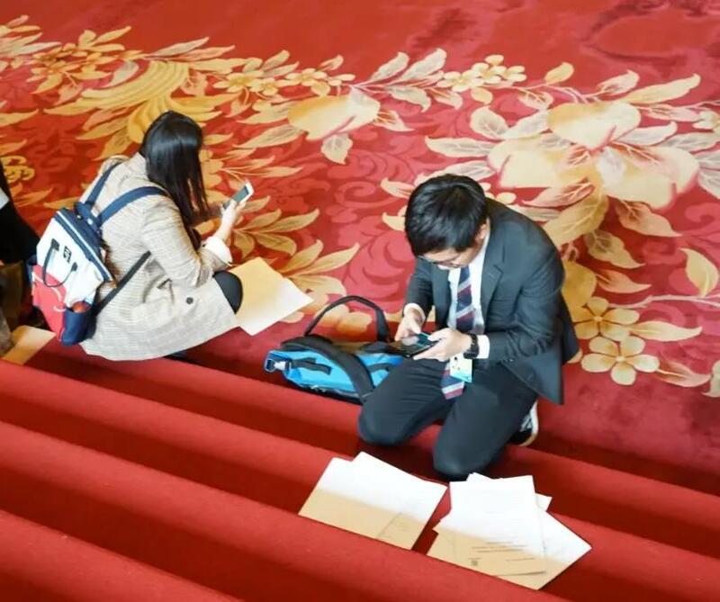 今年两会期间,刚刚拿到资料的记者跪在台阶上写稿。 本报记者 郝天韵 摄