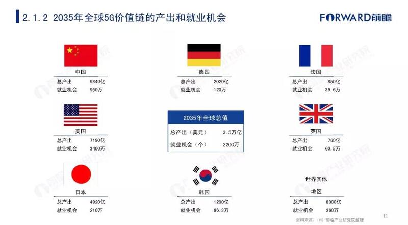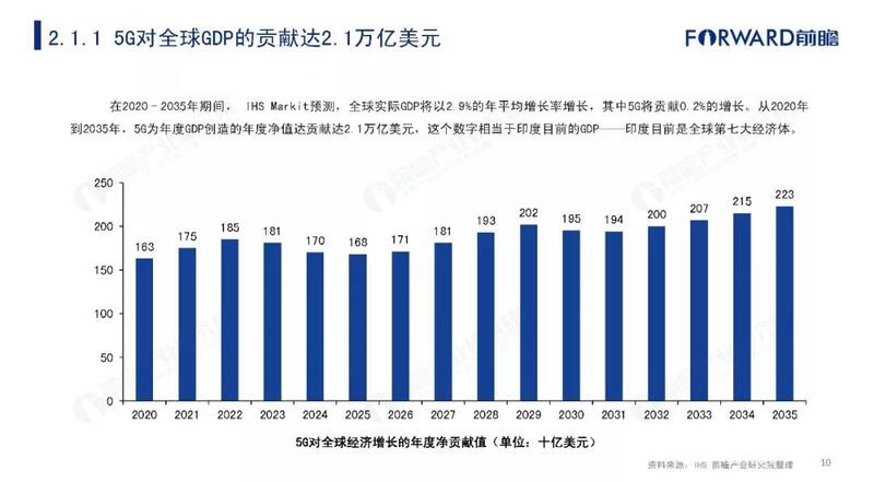 报告引用IHS Markit的预测,指出从2020年到2035年,5G对全球GDP的贡献达2.1万亿美元,这个数字相当于印度目前的GDP——印度目前是全球第七大经济体。