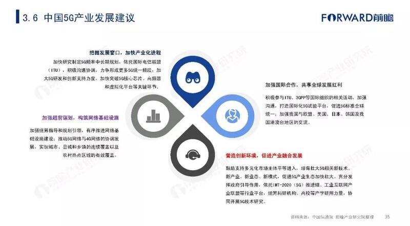 前瞻产业研究院还就中国5G产业发展提出了4个建议:①把握发展窗口,加快产业化进程;②加强超前谋划,构筑网络基础设施;③营造创新环境,促进产业融合发展;④加强国际合作,共享全球发展红利