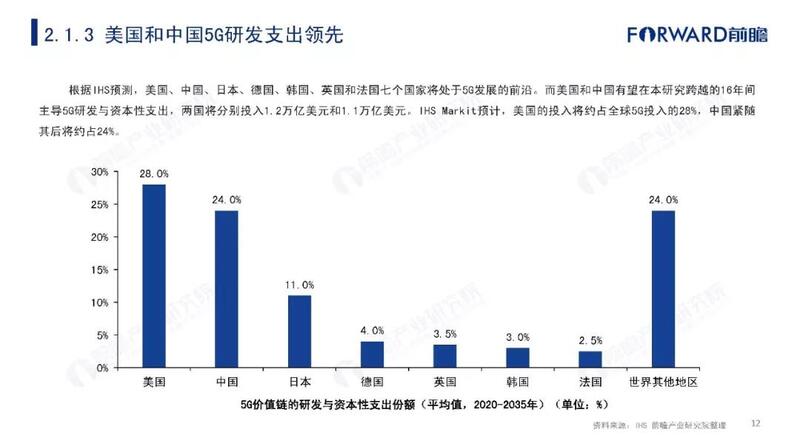 而在5G研发支出方面,报告显示,美国和中国有望在未来16年,主导5G研发与资本性支出,两国将分别投入1.2万亿美元和1.1万亿美元,两者合计占全球5G投入的52%。