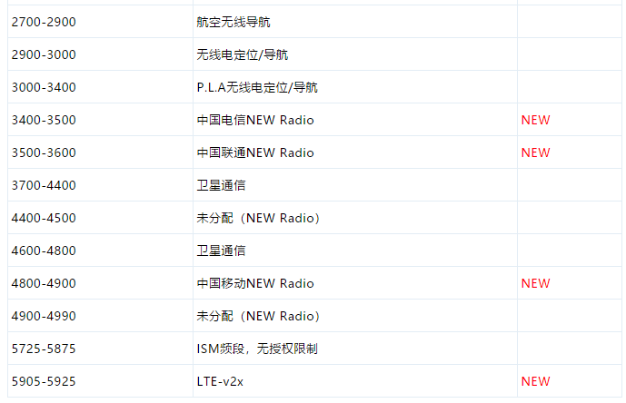 中国电信和中国联通获得3500MHz频段试验频率使用许可,中国移动获得2600MHz和4900MHz频段试验频率使用许可。