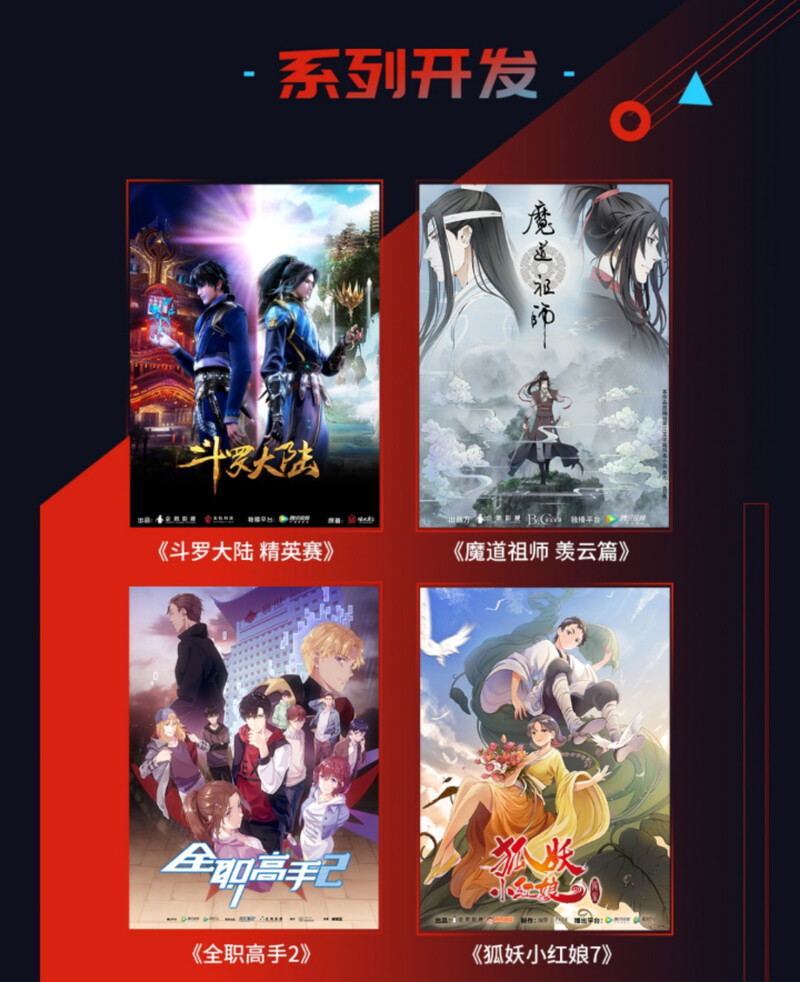目前,在腾讯视频平台播放量过亿的国漫作品已超过100部,过5亿的作品接近40部;《全职高手》《斗破苍穹》《斗罗大陆》等超级国漫自制IP,亦与腾讯视频之间形成了强力的品牌绑定和认知绑定。