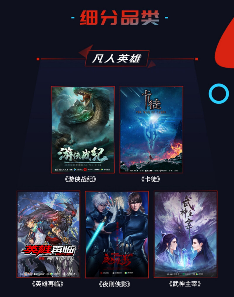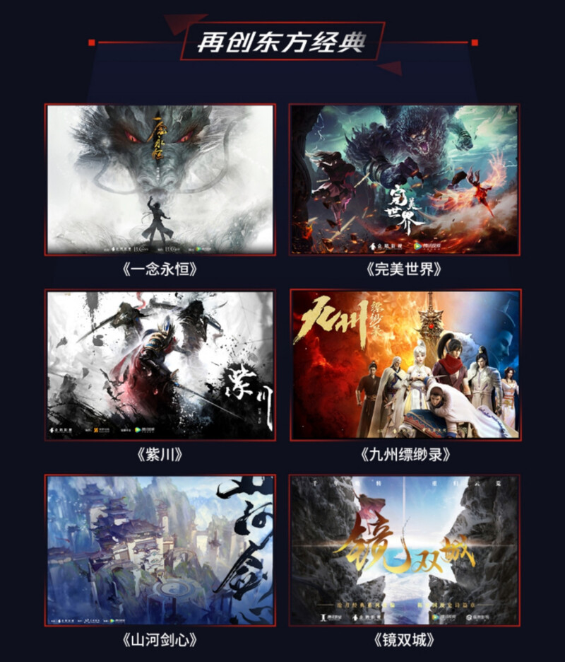 国漫年番《一念永恒》、对华夏古典神话故事进行独创性再造的《完美世界》、互动影视动画《紫川》,以及《九州缥缈录》《山河剑心》《镜双城》等作品,则与东方色彩、热血传奇等元素息息相关。