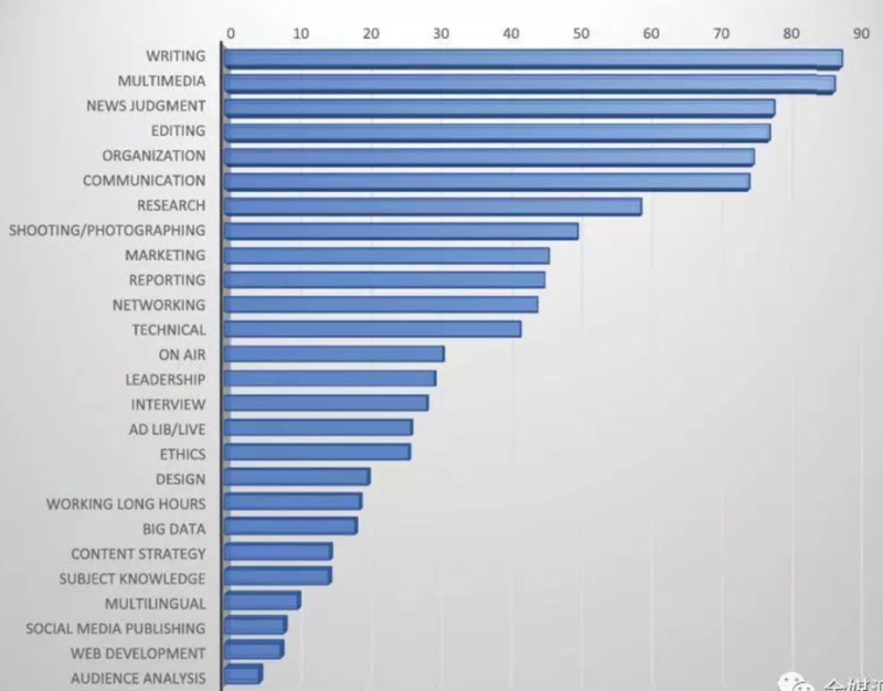 不能否认媒体仅重视文字等传统技能的时代已经结束,其对从业者多媒体技能,包括全媒体采编(Multimedia)、操作编辑部多种软硬件设备(Technical Skill)、设计(Design)、大数据分析(Big Data)、网络开发(Web Development)、社交媒体运营(Social Media Publishing)及受众分析(Audience Analytics)等的要求也愈发广泛及详尽。