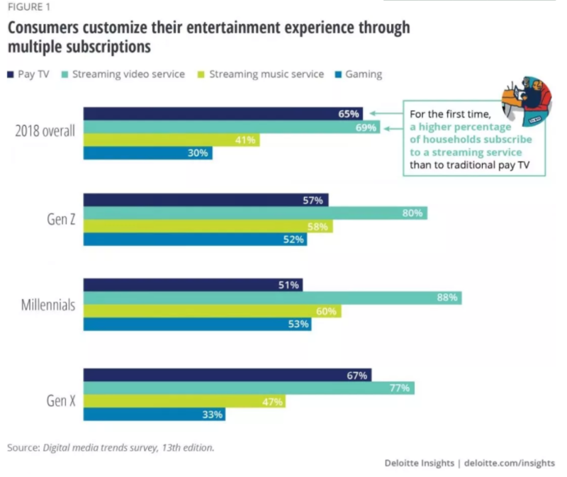 今年,德勤进行了第十三次数字媒体趋势调查,报告指出用户正通过越来越多的订阅渠道满足自己的娱乐体验,获取自己喜欢的内容。付费电视、流媒体视频、音乐和游戏这几个领域是用户最常关注的领域。