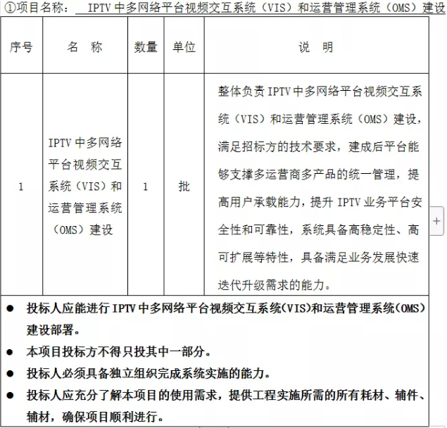 本项目 IPTV中多网络平台视频交互系统(VIS)和运营管理系统(OMS)建设,招标人为重庆广电数字传媒股份有限公司,资金来源为国有控股资金,采购资金已落实,项目已具备招标条件。现对该项目进行公开招标,特邀请有兴趣的潜在投标人参与投标。