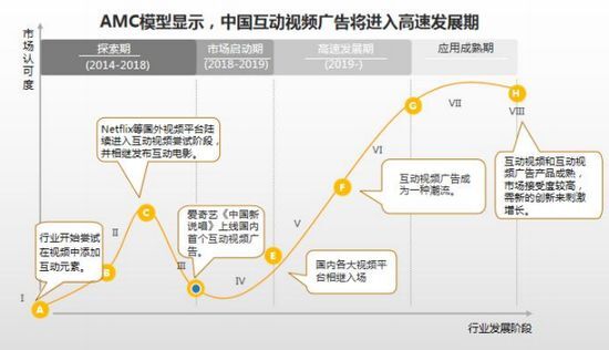 从 AMC 模型来看,中国互动视频广告经历了 2014-2018 年的探索期,在 2018 年底到 2019 年进入市场启动期,预计未来几年将进入高速发展,直至技术、产品和市场达到成熟。