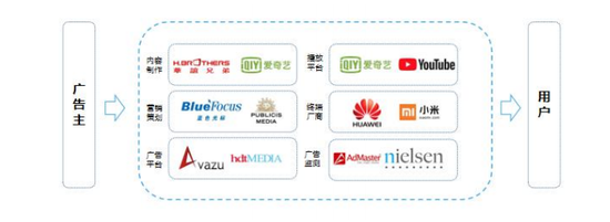 视频广告的产业链已经成熟,上游为广告主,中游是视频运营平台和各类广告技术和服务 提供商,下游为用户。