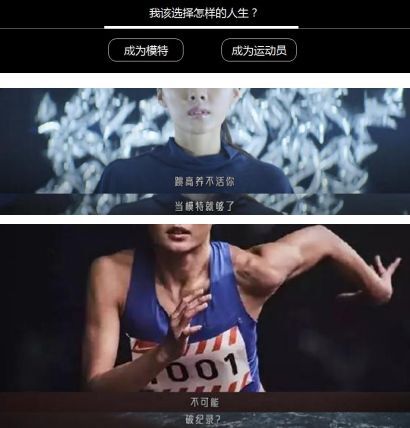 类似的,在广告开头,主角面临 2 个人生选择,让 TA 能有不同的活法,有寓意,能让人 思考。例如,某运动品牌女性系列产品广告,女主角选择做模特还是做运动员(采用分支剧情 互动能力)。