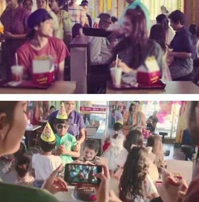 在某快餐品牌 20 周年纪念广告《遇见你的地方》中,男女主人翁 10 年前在快餐店相遇, 10 年后在快餐店为自己的孩子生日会摄影,快餐店鉴证了他们 20 年的经历与变迁(采用分支 剧情互动能力)。