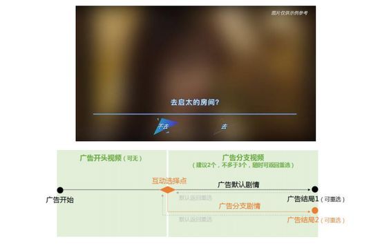 a。分支剧情:该互动能力支撑观众基于自身立场或偏好进行选择,参与、影响广告剧情发 展,并因为不同选择进入到不同的内容进行体验。