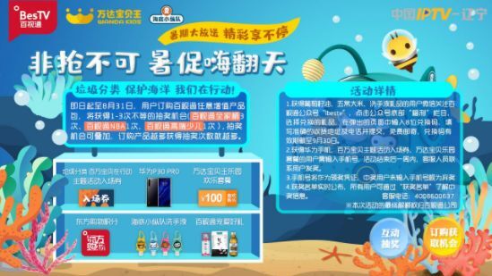 7月23日,辽宁IPTV推出夏日大礼包活动!即日起,打开电视,进入精品-百视通—活动,即可参与抽奖活动。奖品有:华为P30Pro,2000元购物基金,万达宝贝王1000元代金券,宝贝主题活动入场券,万达宝贝王乐园欢乐套餐,精品油,大米,洗手液。