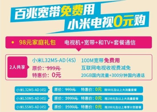 8月1日,湖北孝感移动推出宽带0元享+电视免费送活动!98元家庭礼包,2人共享100M宽带免费用+互联网电视收视费减免+20GB国内流量+300分钟国内通话,小米 L32M5-AD(4S)电视,原价:999元,特惠价:0元。