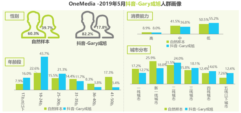 Gary成旭为例,他的粉丝中男性用户占比便超过80%,更是有超过60%用户都集中在24岁以下。