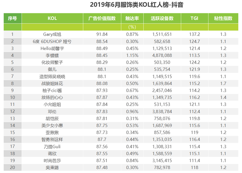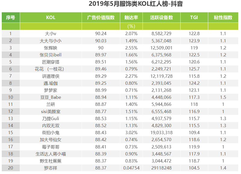 在抖音的服饰类产品KOL榜单中,明星的身影开始出现。邓伦、蒋欣、罗志祥位居排行榜中。但是,综合来看他们的广告价值却并不如一些穿搭造型类KOL,尽管在活跃设备数上他们具备着强大的流量优势,但是他们的TGI数在榜单中却表现平平。这也再次说明,明星在抖音上具备着强推广性,但是在垂直人群的覆盖上还是有所欠缺。