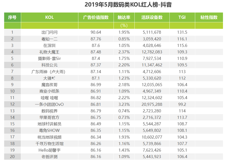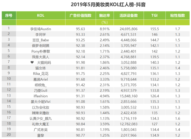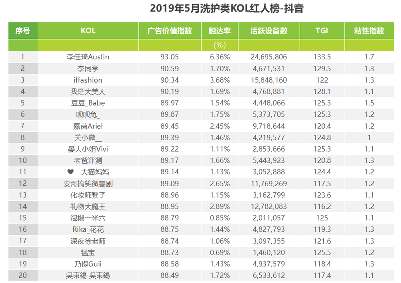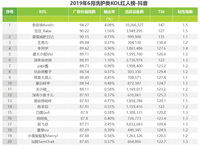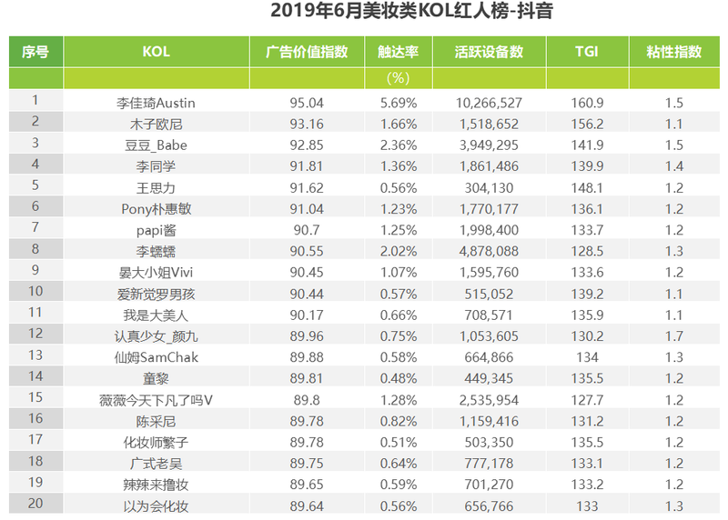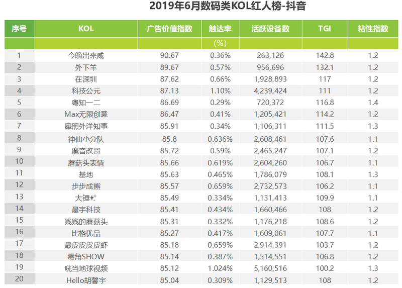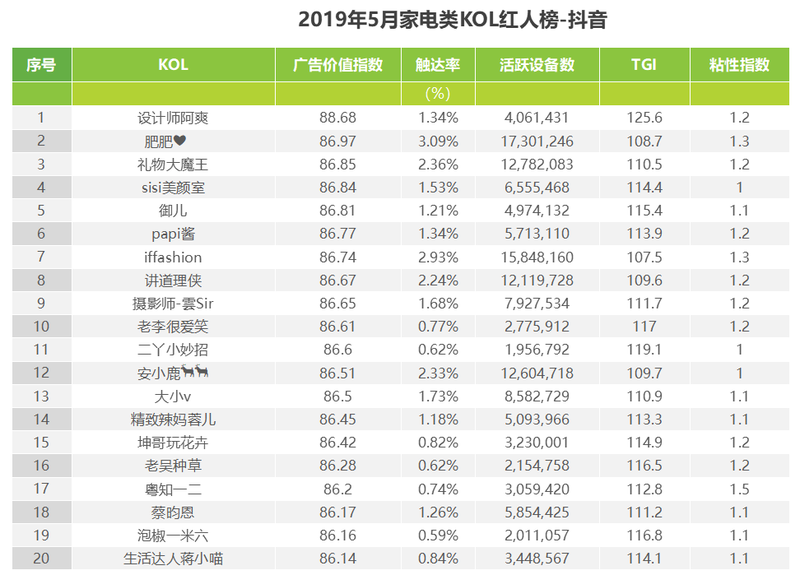 为了给品牌主和各大广告商提供更多借鉴,娱乐资本论联合艾瑞咨询针对家电、数码、美妆、护肤、洗护、家居六大领域出具了抖音月度KOL商业价值榜单。通过广告价值指数、活跃设备数等指标对各领域的KOL进行衡量。其中,广告价值指数结合了TGI、TA触达率、粘性指数,对KOL的广告价值进行综合评定,分值越高,则说明该KOL在抖音对这一品类的目标群里的广告价值越高。所有数据均基于Onemedia数据入库的样本进行核算。