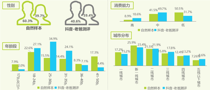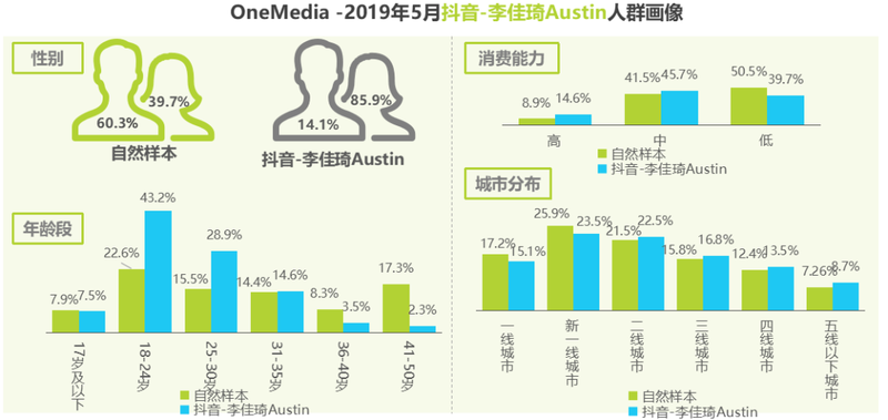 观察其数据可以发现,李佳琦在抖音的粉丝以18岁-30岁的年轻女性为主。由于其粉丝覆盖面十分广泛,所以其受众的消费能力和城市分布与全平台自然样本的受众画像相比并无显著区别。对于这一类已经超过圈层具备了更高的国民热度的头部KOL,其在彩妆护肤洗护领域的短视频带货优势已然可以比肩明星广告。