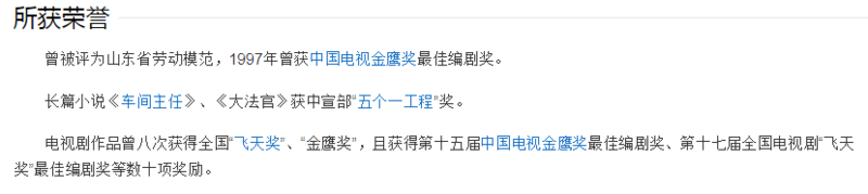 曾被评为山东省劳动模范,1997年曾获中国电视金鹰奖最佳编剧奖。