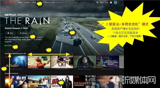 【流媒体网】消息:本文将对Netflix如何构建个性化推荐页面的设计思路及算法选择进行讨论,这是其在数据应用方面最广为人知的特色能力,其目标是让用户在任何设备上登录Netflix时都能够轻松找到自己喜欢的内容。(系列文章阅读:《深度 | Netflix大屏交互设计分析系列(1):基本原则与设计思路》《深度 | Netflix大屏交互设计分析系列(2):遥控器与焦点移动》《深度 | Netflix大屏交互设计分析系列(3):面向内容的交互设计》《深度 | Netflix大屏交互设计分析系列(4):以工程手段构建素材库》《Netflix大屏交互设计分析系列(6):数据、海报与A/B测试》)