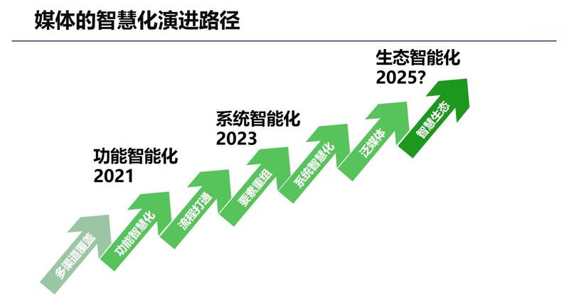 而在经过不断的流冲、打通和要素充足,在2023年的时候,我们将在国内看到第一批成系统的智慧媒体平台出现。现在在央卫上看到的都是局部平台,它并没有把整个所有平台,已有现在的所有生产环节、分发环节、采集环境全面打通,还是局限在局部,在2023年的时候,我们将看到一些新的。就像我们今天谈融媒体中心,过去我们谈中央厨房一样,具有根本性、全面性影响的平台、系统会出现。