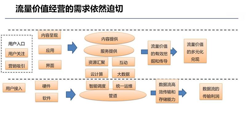上面这张图我印象很深,在两年前的论道上讲过,当时我和灯少做了全国调研以后试图回答一个问题,如果IPTV达到今天这种情况也就是规模触顶以后,整个行业往何处去?当时我们提出来一个名词术语——流量价值经营。这是两年前我用的图,我这次在写材料的时候专门把这张图拿出来看了一下,我个人认为有两点还是能够确定的。
