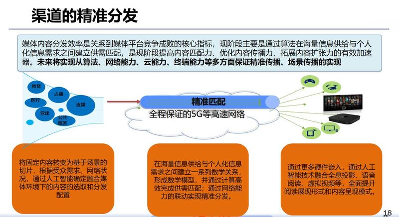 包括我们的精准分发和算法分发。我们知道有一些互联网的新闻客户端以算法分发的先进性著称,但是已经落伍了,原因就是5G给我们带来的是一种万物互联,它所能够给我们提供的这种数据,尤其是周边环境的数据和数据的关联,远远超出今天对所谓用户行为数据这一点点的数据分析的效果。它可以有效避免现在存在的数据污染、数据扭曲、数据泄漏等一系列的问题。我们未来的精准分发将是一个有效的从算法网络能力、云能力、终端能力全面协调统一的一种新的方案能力。