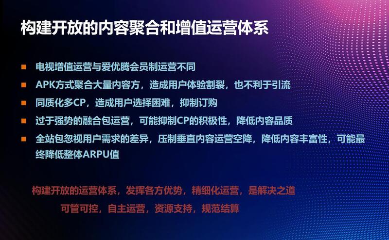 但是强势做融合包运营,其实长远来讲对CP进入是有影响的,最近还有一些运营商做全站包,全站包比专项影视融合包难度更大,挑战可能也更大,可能会更严重的抑制平台内容的丰富性和产业整体合作,当然营销会变简单,可能会有大量垂直发展的机会,所以构建一个开放聚合,增值运营体系,本身是一个大的系统工程,对于我们每一个地域性的运营平台来说,难度还是很大的,需要非常持续的认真发展和呵护。
