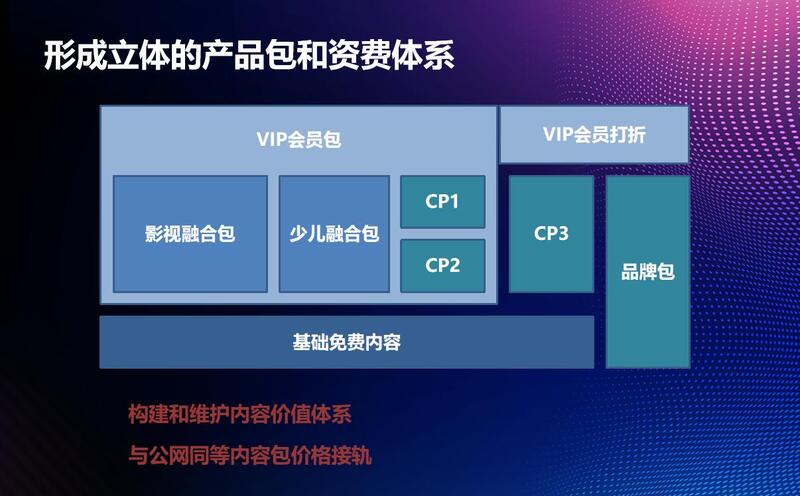 这里简单画了一下简单包的体系,不同运营平台认为从营销角度,处在不同阶段的时候,会觉得CP包太乱了,用户买一个包可能看不到,三个影视包,买哪个呢?或者三个少儿包我买哪个呢?用户体验确实不好,这个时候大家会想做少儿融合包,做个影视融合包,但是影视融合包会面临,如果没有内容怎么办?没有这部分内容就找爱优腾去谈,爱优腾说我不拆,给你一定完整,因为拆我的商业模式不存在了,本来就是靠头部电视剧拉这两个月的会员,我怎么可能给你融合包拉你的会员呢?