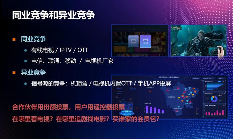 在平台并存的情况下,它的竞争是非常复杂和焦灼的,一方面有同行业的竞争,从有线电视的角度,通常会认为IPTV是一个巨大威胁。从IPTV角度看到专网OTT、公网OTT都是竞争威胁,这些是同业竞争。从电信运营商的角度出发,电信、联通、移动三家在每一个省份也存在宽带和大屏业务的同业竞争。电视机厂家的竞争更激烈。
