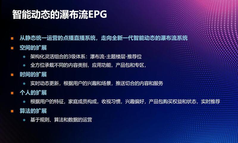 最后会稍微提一下真正持续的电视运营需要产品研发运营一体化的体系来支撑的。从产品的角度,刚才我提到产品有三个大的组成部分,一个是基础EPG,应该说传统意义上的IPTV、OTT是直播节目单和点播内容陈列,是相对传统的静态陈列方式。最近的一两年大家逐渐开始走向把横向排布页面化的EPG走向纵向可以滚动的瀑布流,但绝大多数看到市场在运营的瀑布流只是做到了纵向的延展,换句话说是空间的延展,推荐位变多了,能往下拉了。横向能切瀑布流,纵向能往下拉一拉,很多地方认为这就是瀑布流化。静态的瀑布流其实仅仅完成了简单的空间扩展,实际上我们真正意义上智能动态的瀑布流体系,就是下一代的EPG体系应该完成空间和时间上的扩展,时间是指用户在使用过程中的更新和变化。