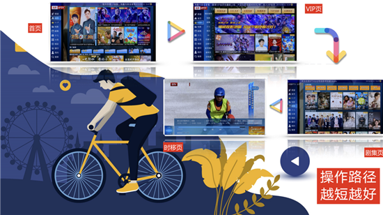 “操作路径越短越好”,这是我们一开始设计的想法,有些人是把菜单做到顶部,那用户向下浏览时走到中间时会有三个选择,我如果想去到另一个地方,比如我从电影切到电视剧,第一个选择是按返回键,第二是原路径返回,怎么进来就怎么向上回退,第三是在底部做一个“返回”按钮返回。我们用的是双纵台排列的模式减少了路径的最短返回路径,不论是在哪个模块,只要向左一按就可以快速返回。