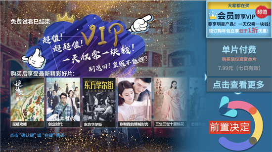 “前置决定”,原来IPTV的产品体系,包括北京自己的产品体系决定这些订购是有非常多产品品类的,有不同的订购方式,包括单点、包月、包月自动续订、90天、180天、微信支付等,如果把这些都提供给用户,最终会很惨烈,用户无所适从,不知道怎么做操作。“前置决策”,我们只给用提供了三个选项,最终用“点击更多”来代替,用户点了后才会出现其他的方式,用户这时的心理是我已经做出了决定,后面是我为这个决定所付出的一系列附属的操作,决定在这页之前就已经做好了。所以“前置决定”能够让订购环节又减少流失,通过一点点工具和细节的打造,让土地耕种的更有效率更有价值,也让每一个环节做到价值最大化。