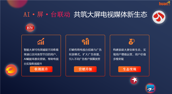我们现在所做的事就叫做AI·屏·台联动,希望大家共筑大屏电视媒体新生态。AI·屏·台可以帮助电视媒体提供收视,进行实时的收视优化,同时可以把原先电视台直播流的招商形态加上大屏端22种广告形态和它原先的直播流打包在一起进行联合招商,发掘一些新的广告容器,同时会实现用户增值,将用户价值进行更多元的变现。