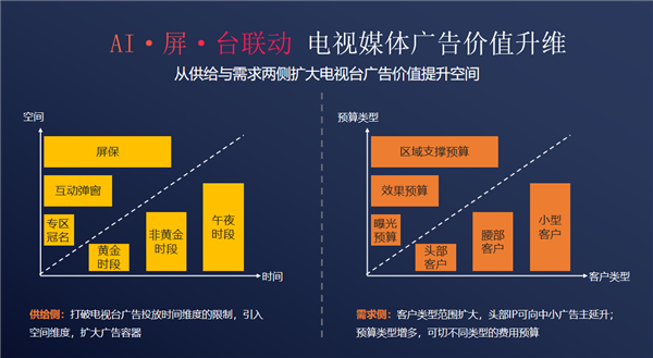 我们AI·屏·台联动的价值提升是从供给侧和需求侧两方面进行了探索。供给侧方面,可以看到电视上对于OTT和IPTV来说,广告形态有开机、屏保、互动弹窗、品牌冠名等。时间段上来说,电视台有黄金时段和非黄金时段,通过这种形式可以看到,我们对于供给侧的纵、横两个方面都有进一步的提升。同时对于客户的预算来说,通常分为品牌预算、效果预算和区域的活动支撑预算。以前电视台通常拿到的就是品牌预算,包括OTT广告拿到99.9%全是品牌预算,通过这种方式,对于区域化支撑的区域预算及效果预算都能够有效纳入进来。对于除了头部客户之外的腰部客户、小型客户也可以更好地进入大屏营销的门槛。