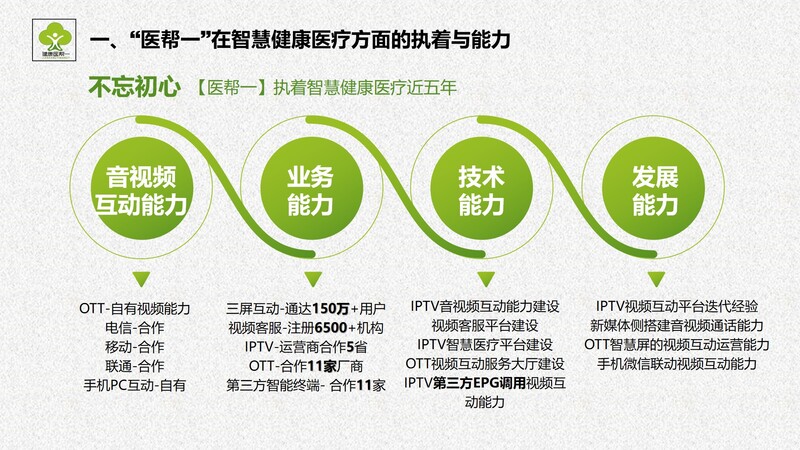 “医帮一”做到现在,努力的方向一直是基于智能电视,包括在OTT、IPTV等渠道通过音视频互动的方式,提供家庭健康医疗服务。这么多年来我们积累了什么能力呢?