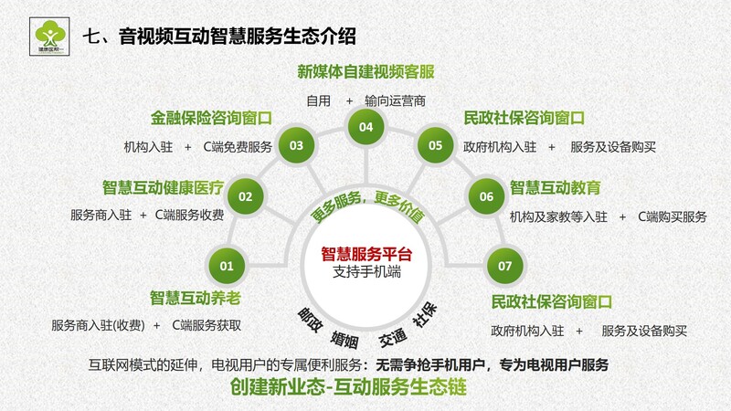 保险金融服务导入也是平台接下来要做的,一旦进入家庭之后,这些机构可以直接跟客服沟通,对面的客服来自金融机构、保险机构,而且业务基于运营商IPTV,可信度非常好。此外还包括民政、社区服务热线、智慧教育等。