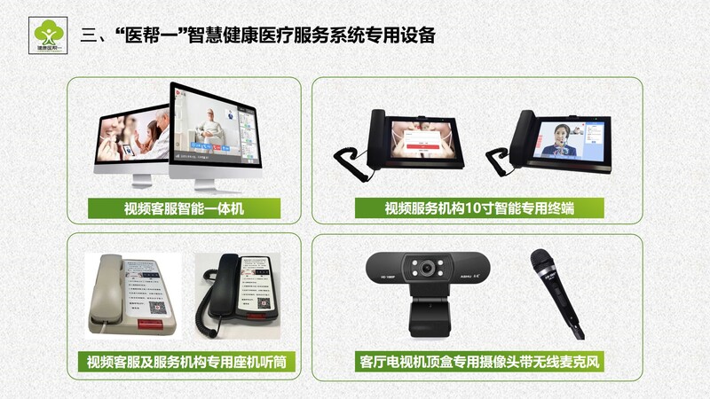 医帮一智慧健康医疗服务系统专用设备是经过四年多设计的产品,为什么不用电脑呢?按照体验来说,我们希望用户使用的是一个专用的设备,就像电话机。下图的左边就是我们定制开发的客服专用智能终端,例如在医院里,如果医生老是守在终端前不太现实,用户呼叫的时候需要铃声响,所以我们提供了一个电话座机,医生接起来时可以看到对方,客服也可以看到用户方,这个用量目前比较多;图片右上角两个项目也是定制化的,无论你当时在忙什么,电话铃声响起时,你拿起来就能接听,放下来就挂掉,还能看到对方的实时画面;图片右下方的这个产品,可能有些人比较好奇,因为在电视大屏渠道做专做音视频互动服务的企业比较少,可能有些人还不是很能理解,我们说设备上有摄像头有麦克风,但当你坐在沙发上,虽然语音麦克风没问题,但对方听的效果不好,有相当的距离感。所以我们专门为摄像头定制了一个麦克风,这个麦克风一方面可以让人交流的时候声音很近很亲切,而且价格也不是很贵。