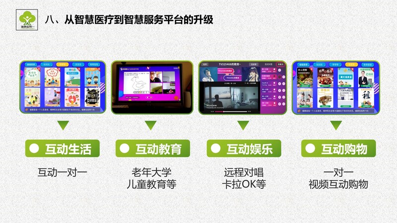 先介绍“医帮一”自己做的一个内容——智慧健康医疗服务大厅,有几个方面。一方面基于传统健康类的视频点播,主要为卫健委、专业医疗机构做公共卫生的资讯传播,这是非常重要的;二是视频客服,我们在几个地方建有自己的视频呼叫中心,这个呼叫中心不像现在的电话呼叫中心那样看不到人,视频客服可以让用户看到人,并且和客服面对面进行有温度的沟通,我们的呼叫发起端基本都在OTT或IPTV端;三是服务导入,和客服视频通话除了沟通聊天,我们可以把用户需求整理后转给对应服务的提供方,现在我们签约了6000多家大大小小的医疗、健康、养老服务机构;第四是我们现在有一个智能客服,去年下半年开始研发,现在基本可以跑DEMO,争取明年上线。这个智能客服看上去像真人,实际上是一个虚拟的人。可以参考虚拟主持人的形象,是通过VR方式实现的。