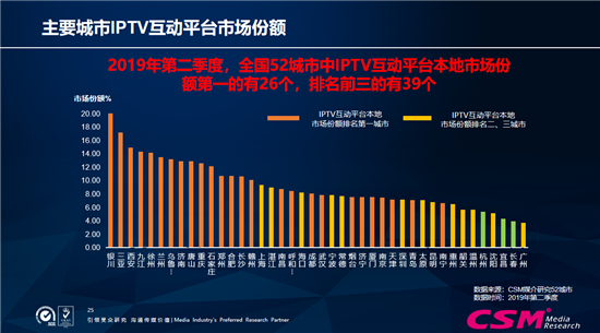 今年第二季度,全国52个城市中IPTV互动平台本地市场份额第一的有26个,排名前三的有39个。也就是说,26个城市在本地的市场份额按频道来看,排第一位的。比如5月天津IPTV互动平台市场份额为7.60%,占整体互动平台市场份额42.18%,本地收视排名第一。