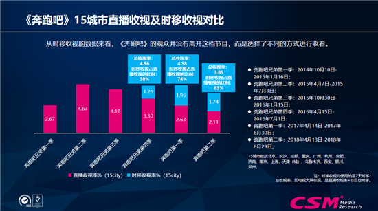 有一组数据显示,《奔跑吧》在15个重点城市的收视数据,红色的是直播时的收视,蓝色是大屏中点播回看的数据,包括IPTV和部分有线、OTT,所以大屏的收视价值在头部当中反应是非常大。《奔跑吧》第二季点播、回看等时移收视占直播收视的比例为83%,就是说大屏中有两个人在看直播,就有1.7个人在看点播,非直播收视可以说非常高了。整体来看这个节目的收视没有大的降低,大屏直播收视的价值在向点播转移。