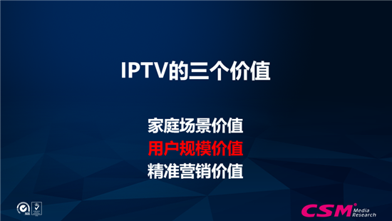 回到IPTV的三个价值上,今年在8月份我们跟流媒体网在北京做了IPTV产业研讨会,其中一位嘉宾提到:从广告的角度来说,他们认为IPTV的三个价值是:家庭场景价值、用户规模价值和精准营销价值。