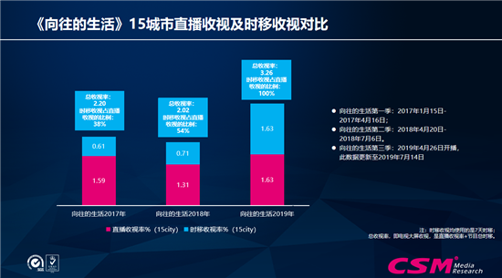 《极限挑战》也是如此,时移收视占直播比例达到45%。《向往的生活》是非常典型的例子,过去三年红色直播部分的收视基本保持不变,1.59%、1.31%、1.63%,稍有提升,但如果加上大屏的点播和回看就完全不一样了,这就是大屏的收视价值在向点播扩散,直播的收视继续保持不变,但是大屏的点播回看在迅速增加。所以这是个增量市场,增量市场量变就会带来质变。