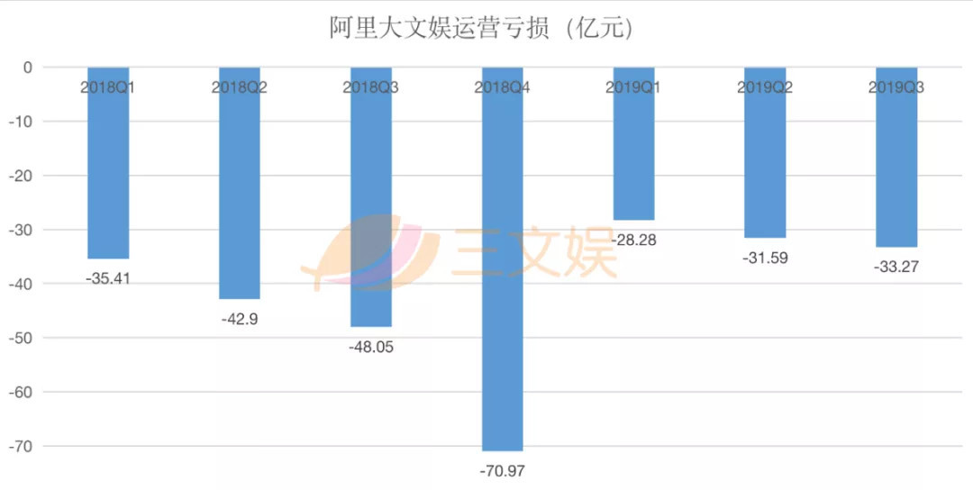 第二和第三季度,虽然阿里大文娱的运营亏损虽然同比去年同期均有下降,但亏损额仍高达31.59亿元和33.27亿元。