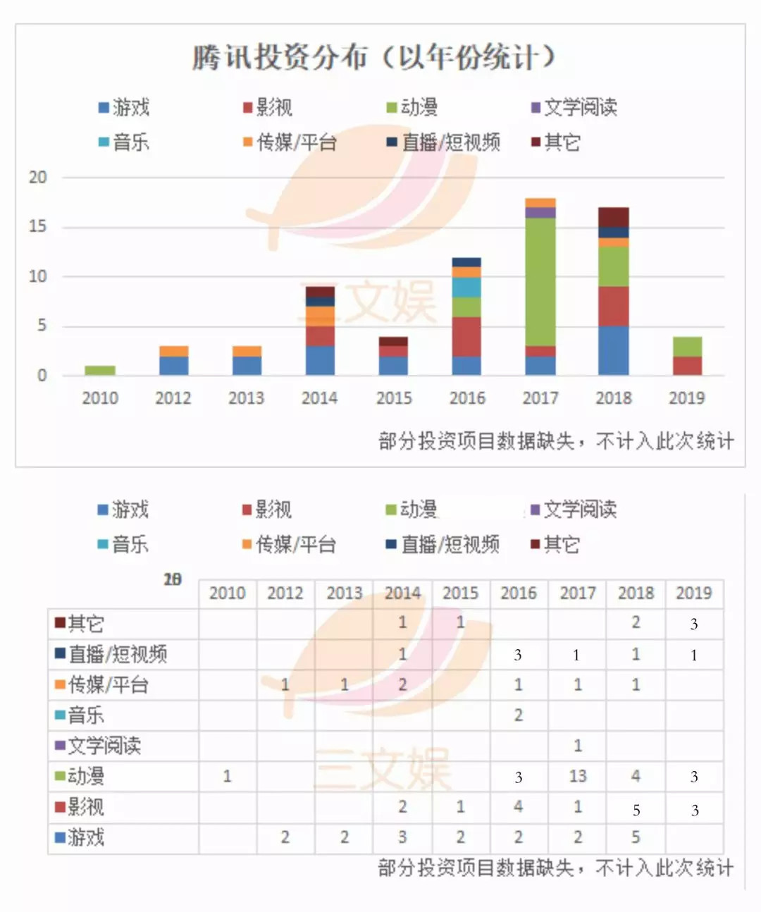 在架构调整之前,腾讯对动漫等内容的上游领域投资动作频频,比如2017年就投资了包括动漫堂、徒子文化、十字星、乐匠、悟漫田、丛潇、铁鳞社在内的10多家动漫工作室,总投资金额过亿。2018年腾讯做了一些投资上的调整和优化,投资案例数量相比于2017年是锐减,但依然是文娱投资方当中的大玩家。