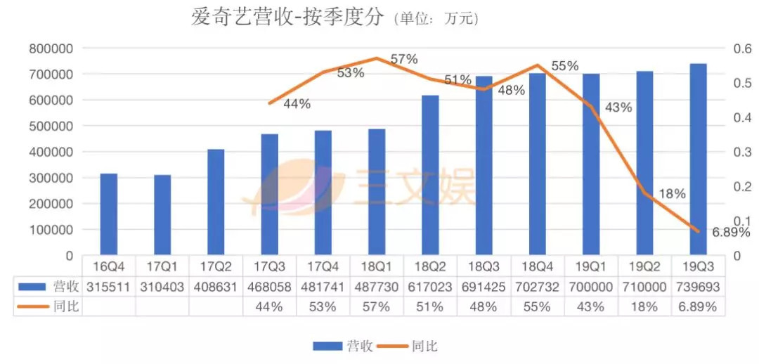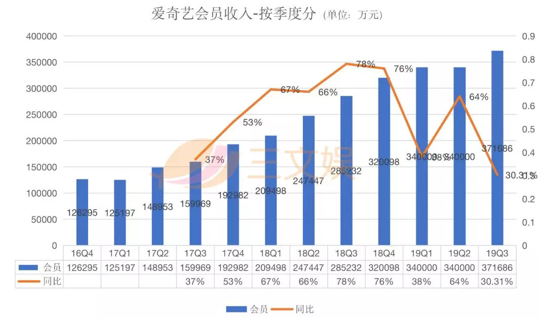 2019年第二季度,爱奇艺订阅会员规模达到1.005亿,同比增长50%,订阅会员营收同比增长38%。到了第三季度,来自会员的收入同比增长30.31%至37.17亿元,首次在总营收的占比超过50%。