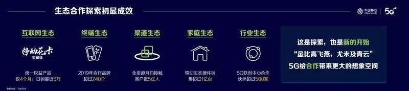 前期,中国移动在终端、渠道、内容等生态合作方面开展了探索,取得了一些成绩。比如,今年6月底,联合互联网伙伴共同推出“移动花卡宝藏版”,通过打造集中的全网产品配置平台,强化销售触点流量运营,构建线上线下协同的交付能力,仅用四个月时间,日订单量已接近5万。这些探索仅仅是开始,“虽比高飞雁,犹未及青云”,在未来的发展道路上,在5G的巨大机遇前,我们将不断提升合作意识、合作能力,实现更广领域、更高层次的生态合作。