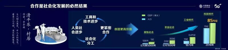 合作推动了人类社会的发展。“打开人类的历史画卷,工具和技术的进步推动了人类社会的进步,社会化分工不断细化,有分工就意味着有合作。辛弃疾的《清平乐·村居》提到‘大儿锄豆溪东,中儿正织鸡笼。最喜小儿无赖,溪头卧剥莲蓬’,描述了农业时代典型的家庭分工合作场景。”简勤说。