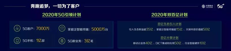 中国移动将实施5G引领计划和双百亿计划。2020年将发展7000万5G用户,销售3亿笔5G业务、1亿部5G手机、5000万台家庭泛智能终端和1500万行业模组;投入百亿引入生态权益、家庭泛智能终端和大屏内容,在移动云、DICT集成应用和行业智能硬件领域与合作伙伴分享百亿规模的新增收入。